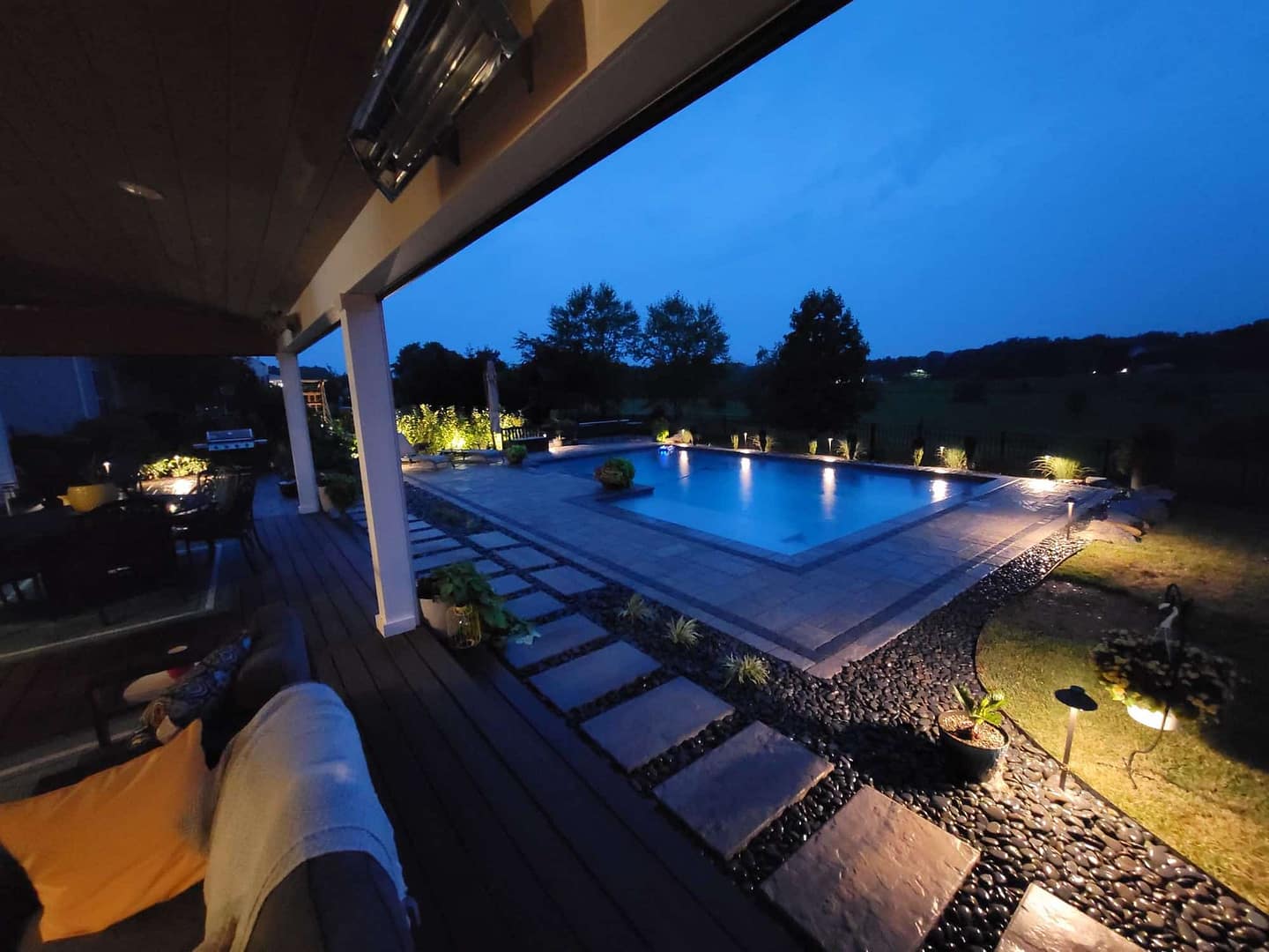 This project had a huge impact on the entire property. We designed and built a complete outdoor oasis for our clients which includes a new swimming pool, pool house, covered composite deck with a gas fireplace, a patio and walkways around the house, landscaping, and lighting. We installed infrared heating and remote-controlled screens so that our clients can enjoy outdoor living on their deck for an extended season.